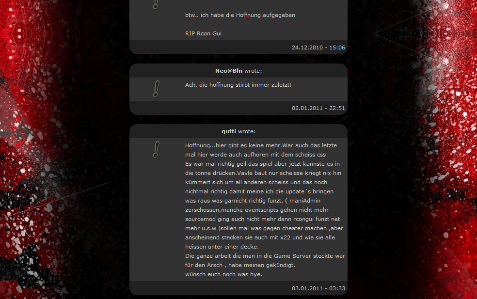 ˜"°º . . . . • . . . . º°"˜ "˜"°º º°"˜" Irgendwie kann ich ihn verstehen, was er da schreibt ist wirklich zum kotzen mit Valve/Steam Machen alles andere als im sinne der ordendlichen und ehrlichen Fairen Spieler. Zitat: update´s bringen was raus was garnicht richtig funzt, ( maniAdmin zerschossen,manche eventscripts gehen nicht mehr sourcemod ging auch nicht mehr dann rcongui funzt net mehr u.s.w ) Nicht vergessen Zblock auch lahm geleckt und und und... können wir uns dagegen währen, oder müssen wir es sogar tun. Den wir haben ja unser spiel bezahlt und müssen uns jetzt das alles gefallen lassen? schreibt euere Komentare was ihr davon haltet "˜"°º º°"˜" -=** Kommentare bitte hier **=-